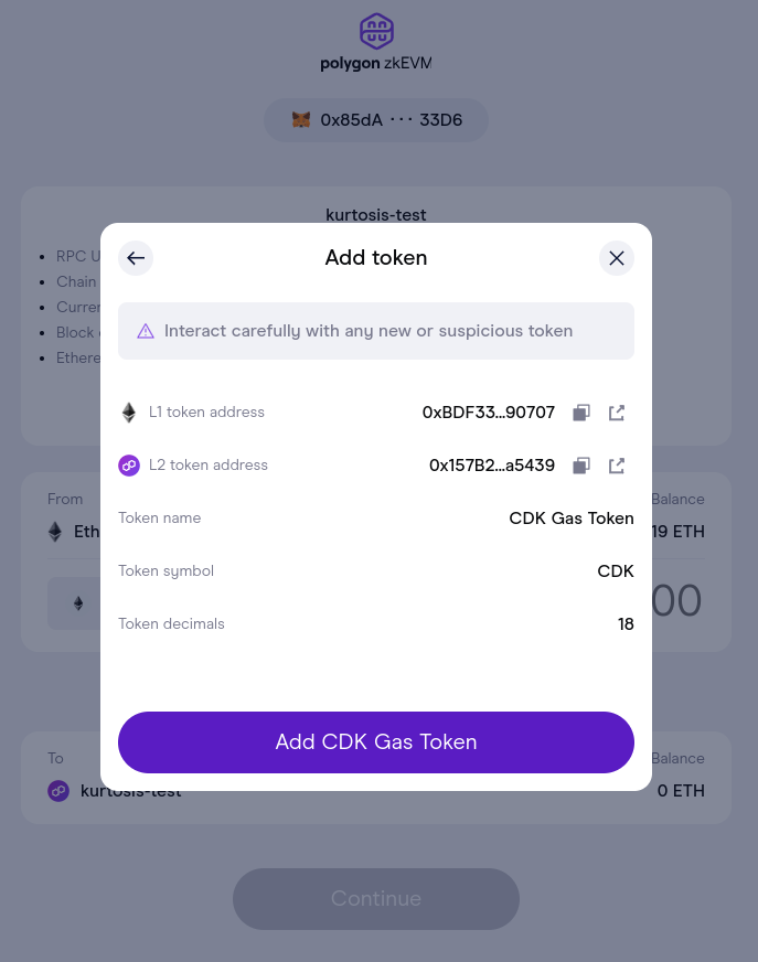 gasTokenAddressfrom the generated files:kurtosis service exec cdk-v1 contracts-001 "cat /opt/zkevm/create_rollup_parameters.json" -