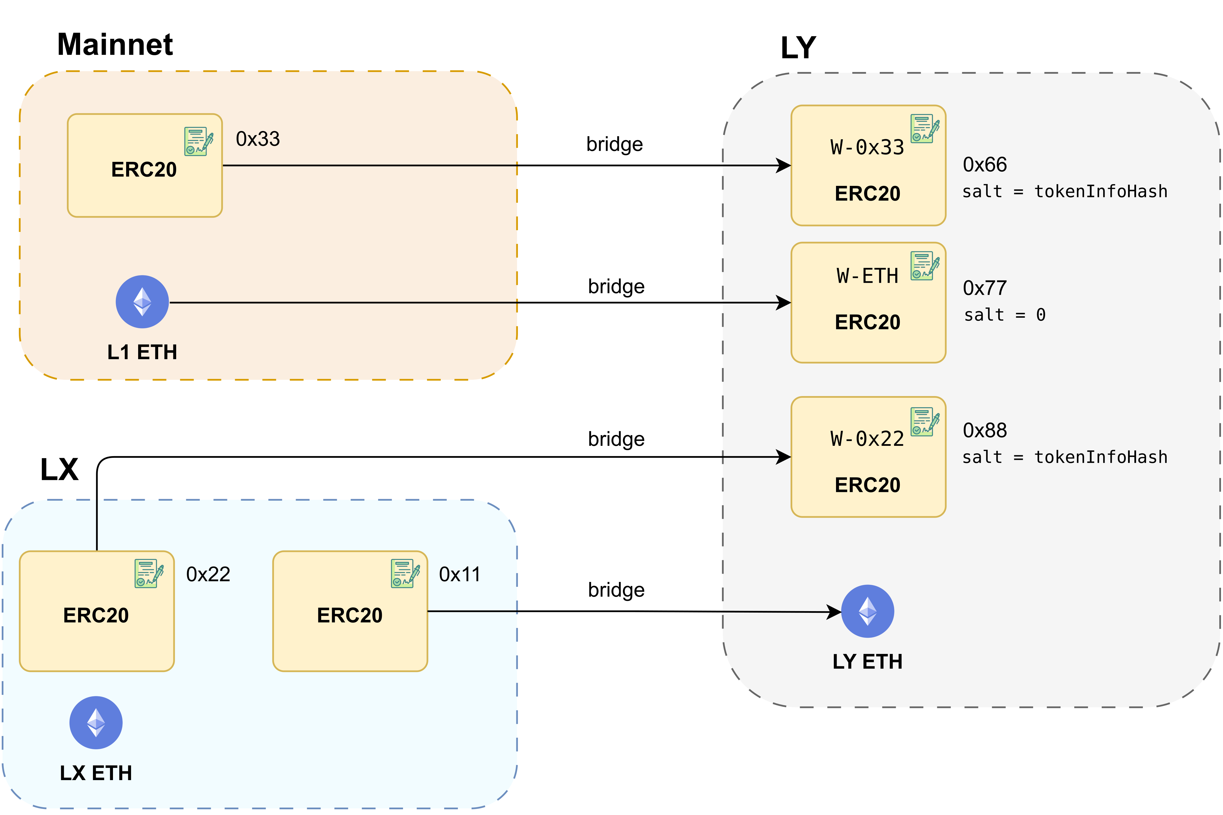 It depicts several scenarios, such as bridging an ERC20 token from mainnet to another ERC20 token in LY, bridging L1 ETH to the LY gas token, or bridging a wrapped ERC20 token living on LX to LY ETH.
