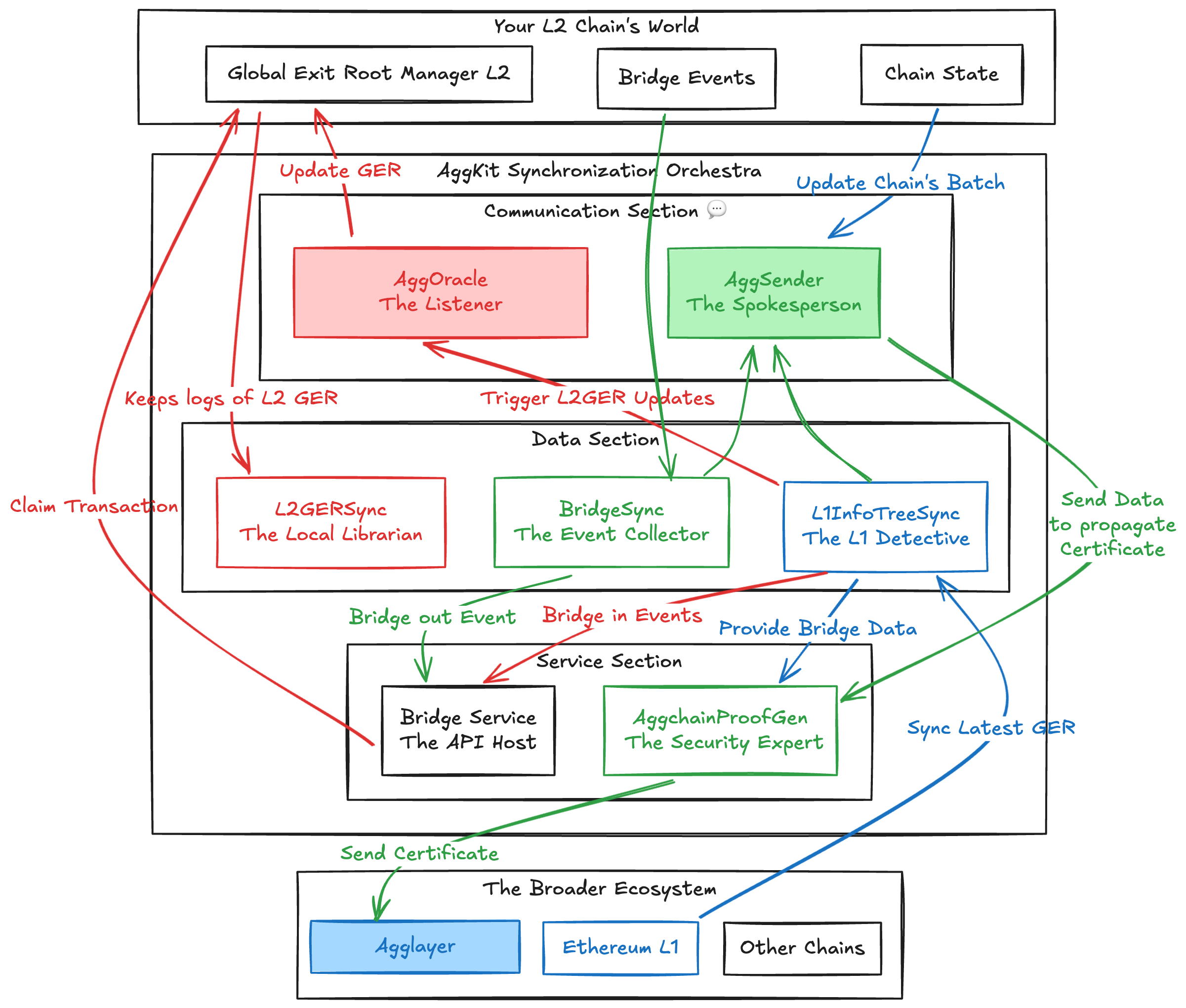 In the middle tier, you have AggKit components working together like a well-orchestrated symphony. Each component has its specialized role, but they all coordinate to ensure seamless synchronization:
