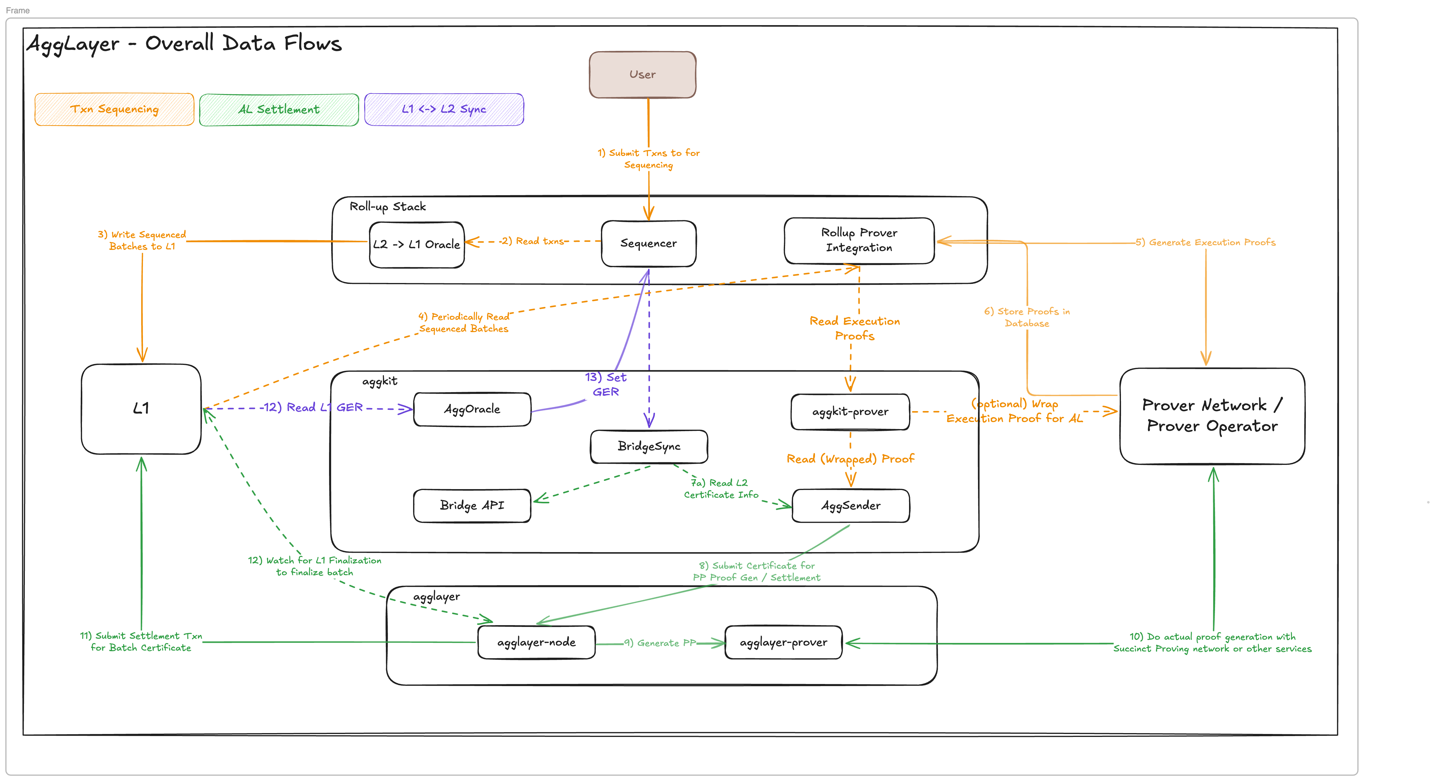 Figure 1: Agglayer Overall Data Flows - showing transaction sequencing, settlement, and L1-L2 synchronization processes