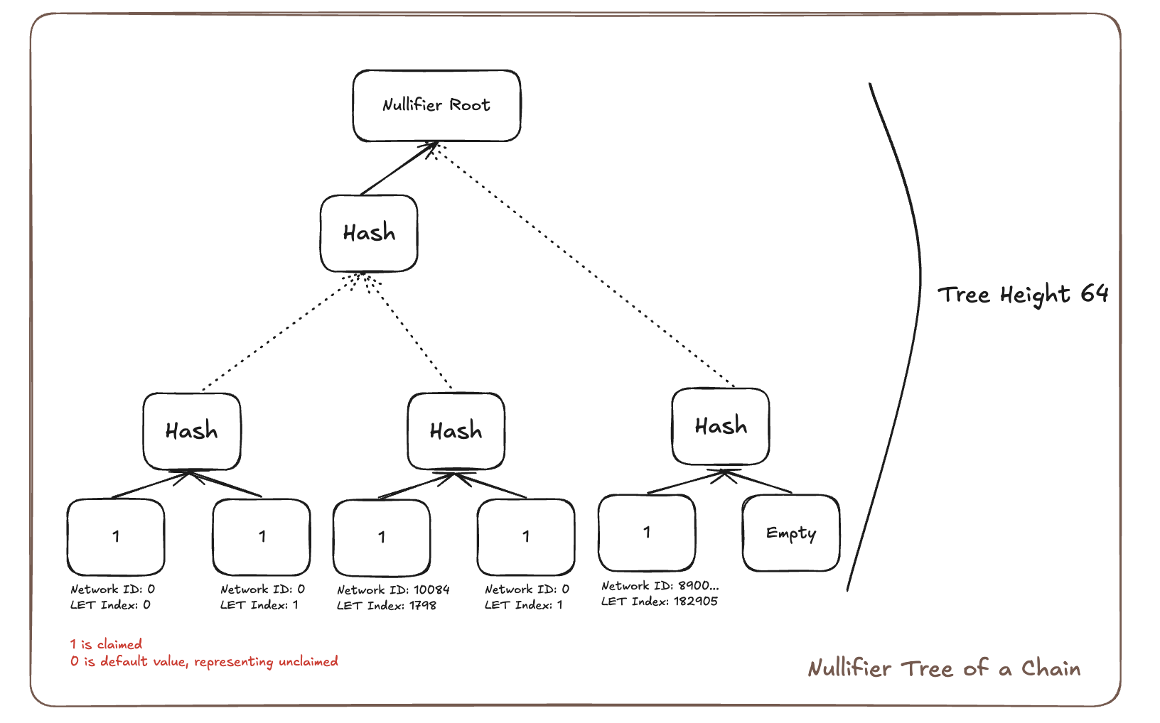 Nullifier Tree: Prevents double-spending of claimed assets by maintaining a 64-bit depth Sparse Merkle Tree that marks imported bridge exits as claimed, ensuring that each cross-chain transaction can only be processed once on the destination chain.