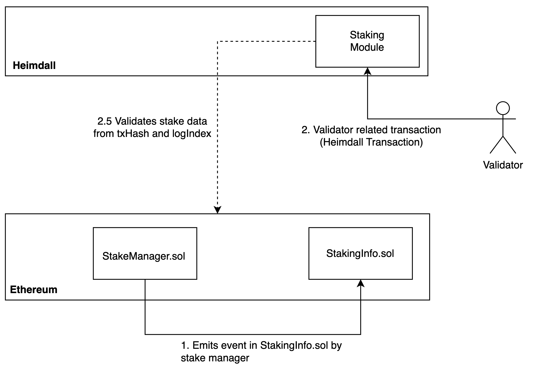 MsgValidatorJoin: This message is triggered when a new validator joins the system by interacting withStakingManager.solon Ethereum. The action emits aStakedevent to recognize and process the validator’s participation.MsgStakeUpdate: Used to handle stake modifications, this message is sent when a validator re-stakes or receives additional delegation. Both scenarios trigger aStakeUpdateevent on Ethereum, ensuring Heimdall accurately updates the validator’s stake information.MsgValidatorExit: When a validator decides to exit, they initiate the process on Ethereum, leading to the emission of aUnstakeInitevent. This message ensures that Heimdall records the validator’s departure accordingly.MsgSignerUpdate: This message is responsible for processing changes to a validator’s signer key. When a validator updates their signer key on Ethereum, it emits aSignerUpdateevent, prompting Heimdall to reflect the new signer key in its records.