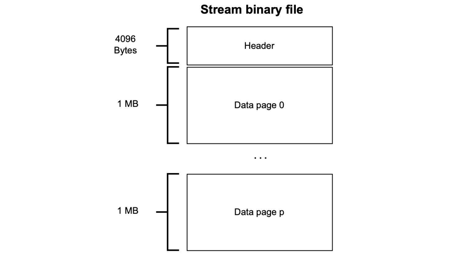 Next is an explanation of the stream file structure. The stream file is created in a binary format instead of a text file. It has a header page and one or more