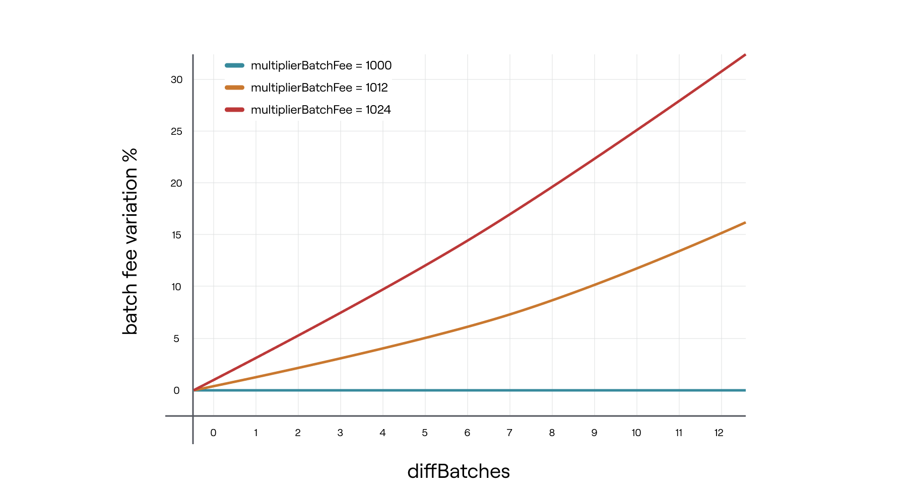 veryBatchTimeTarget, which is the targeted time of the verification of a batch, so thebatchFeevariable is updated to achieve this target, andmultiplierBatchFee, which is the batch fee multiplier, with 3 decimals ranging from 1000 to 1024.