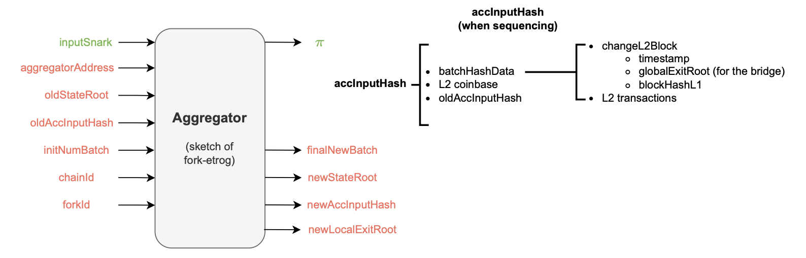 • The aggregator receives several inputs, such as the oldStateRoot\texttt{oldStateRoot}, initNumBatch\texttt{initNumBatch} and oldAccInputHash\texttt{oldAccInputHash}.
