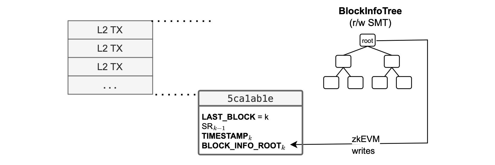 As shown in the figure below, while transactions within the block are processed, the zkEVM not only updates the L2 state but also adds the information to the BlockInfoTree\mathtt{BlockInfoTree}.