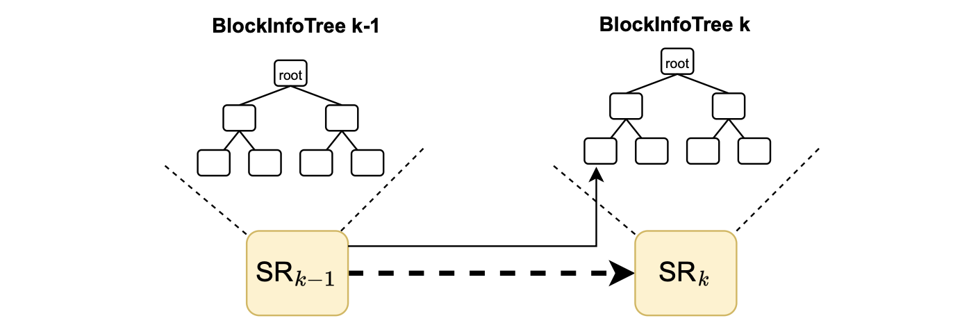 It is important to mention that the state roots of the block info trees are linked, as depicted in the figure below.