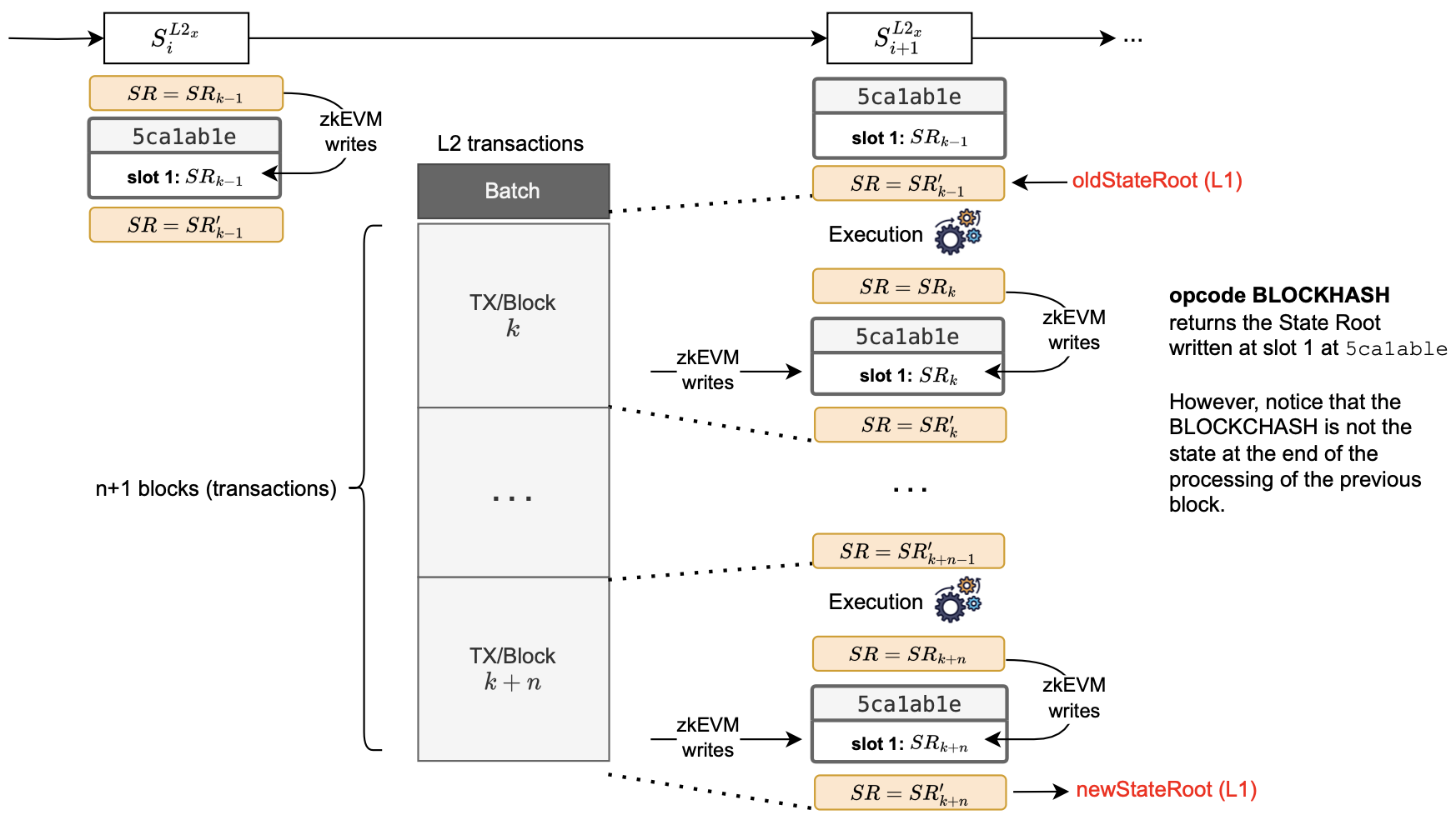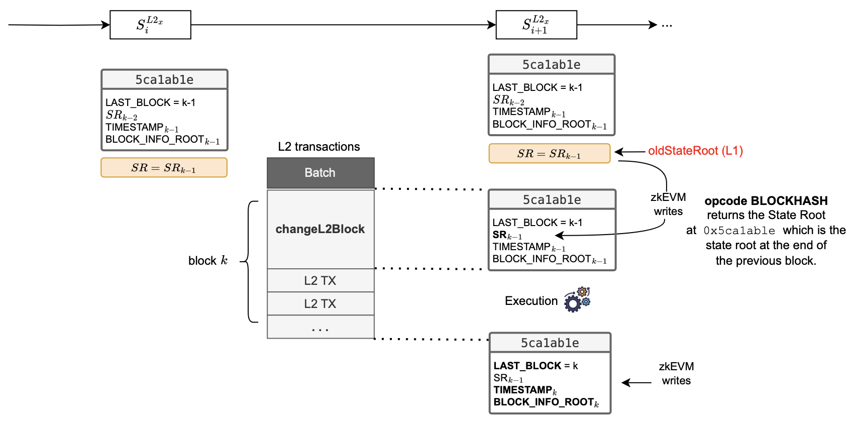 After completing the processing of the last block k1k-1, the zkEVM updates the slot 1 of the 0x5ca1ab1e smart contract with the current state root.