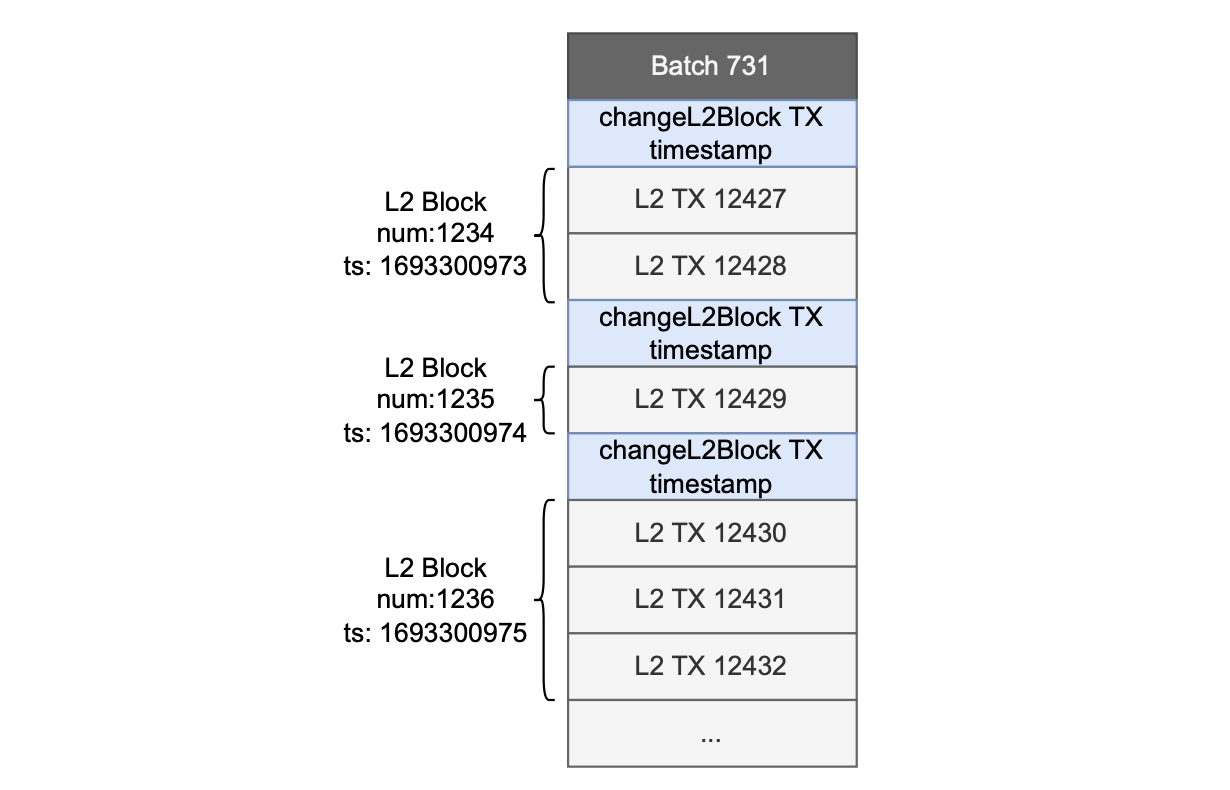 • An L2 block is defined to contain only one transaction, resulting in as many blocks per batch as there are transactions.