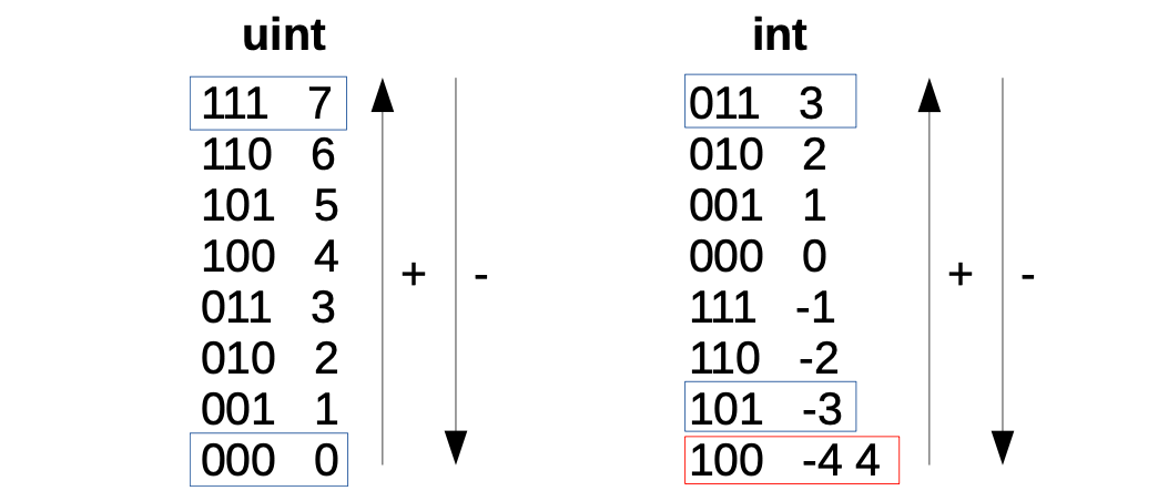 Finally, notice that with unsigned integers, there is a caveat since 4 and -4 have the same codification.