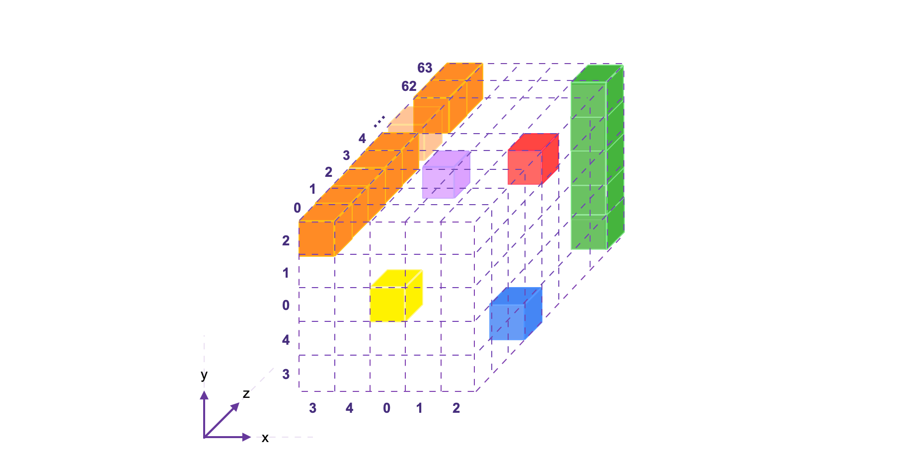 So then, the bit at coordinate is in fact the one-thousand-and-ninety-second bit of , because . This bit, , is represented in the above figure by the blue cube. See more examples of this correspondence in the table provided below.