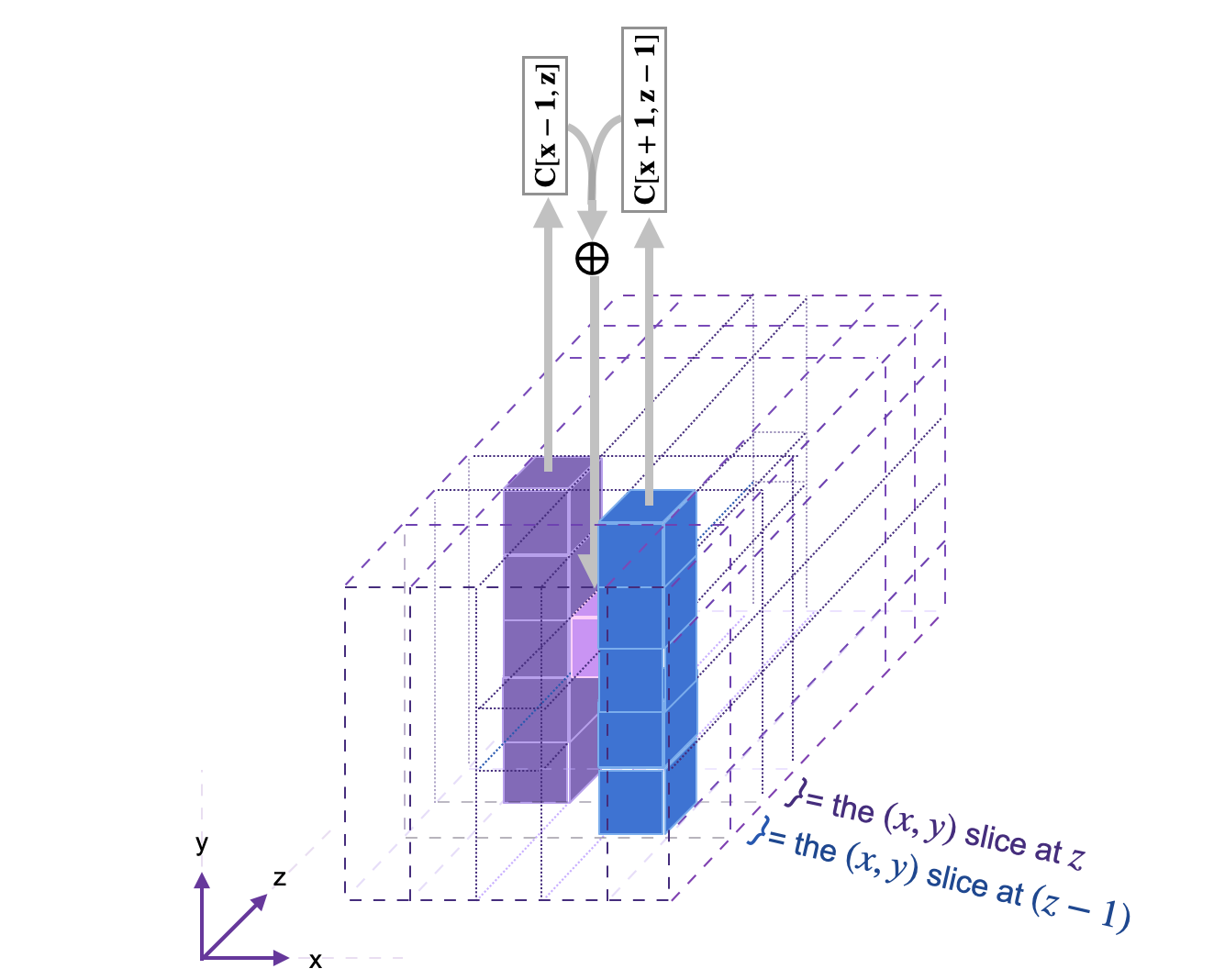 A bit in the state can be denoted by as an element of the 3D-array state, but as to indicate its location in position with respect to the Cartesian coordinate system.