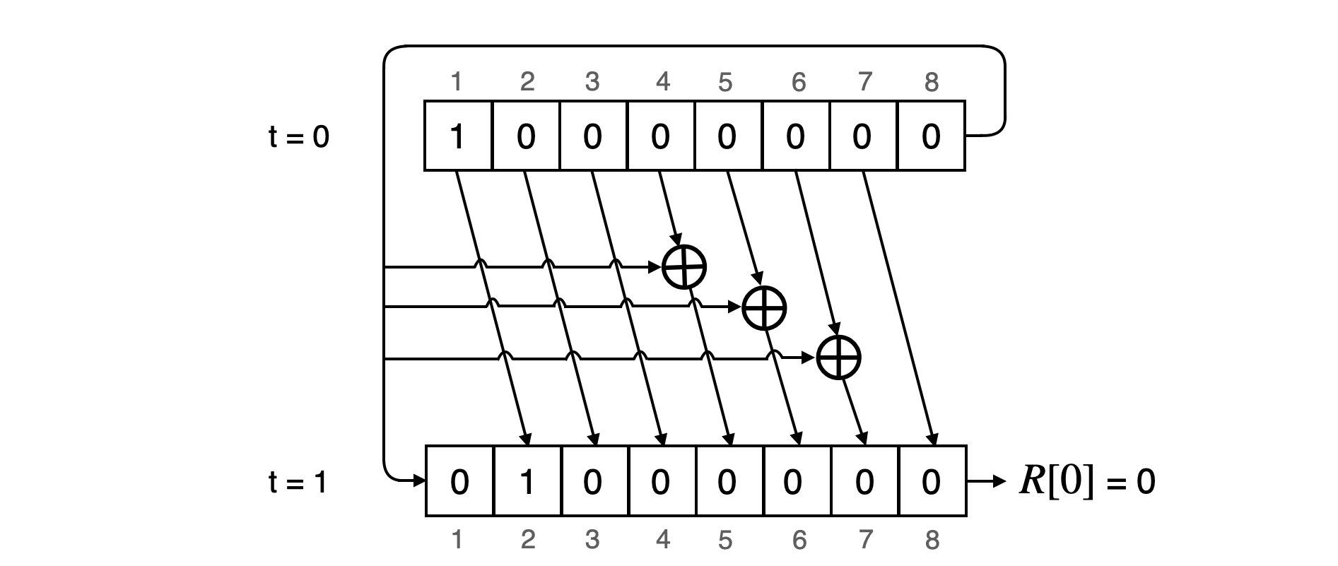Since the LFSR is initialised to at , its state at the end of 7 state transitions is . So . After the 8-th state transition the state of the LFSR is , and thus . The next table displays generation of the 7 bits needed to construct the second round-constant, . That is, the LFSR's state transitions for to .