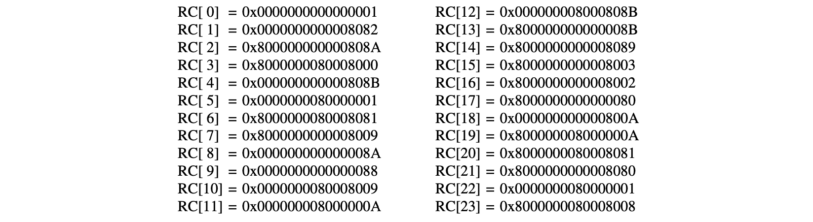 The step mapping adds 64-bit round-constants, , so as to disrupt any symmetry in the computation of the round outputs. Note that is the round index, . Hence, 24 distinct round-constants are required, and are denoted in array notation as,