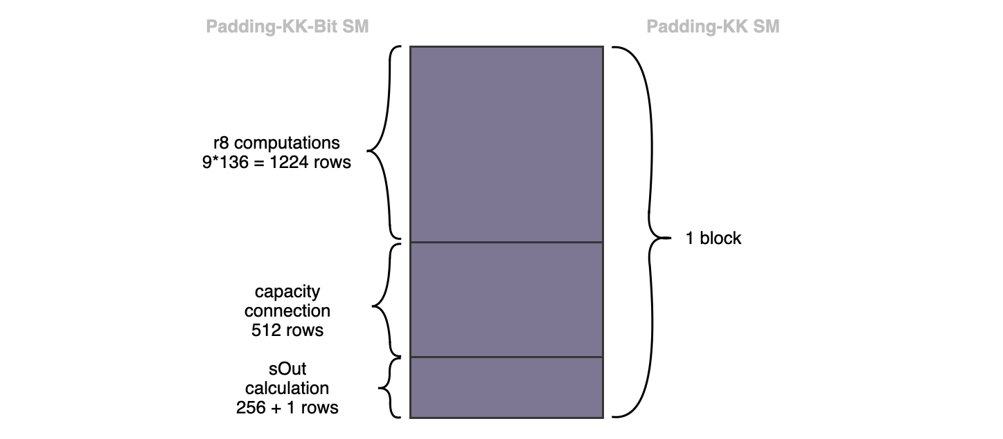 A block of 136 rows of bytes in the Padding-KK SM corresponds to rows in the Padding-KK-Bit SM. The picture below, displays the correspondence, also shows three subdivisions of the rows (corresponding to ).