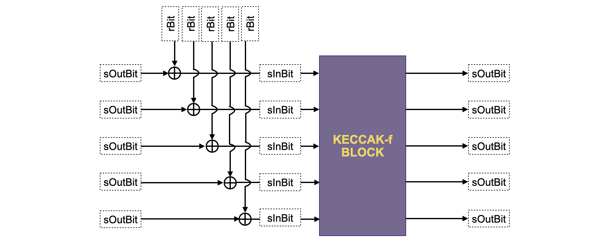 The register is actually computed from , and columns. Recall that, at the first block of the sponge function, the input bits to the KECCAK-F permutation actually coincide with . However, after the first block, an of and must be performed, as seen in the above figure.