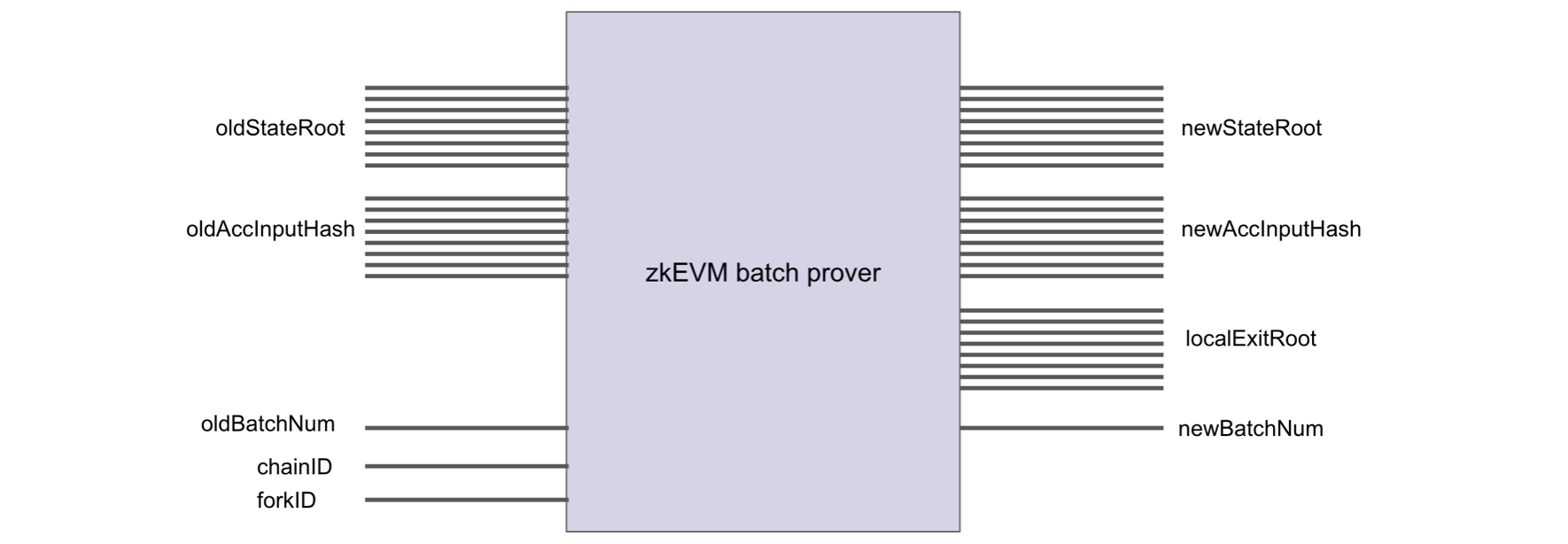 The zkEVM batch prover takes as inputs; the oldStateRoot, oldAccInputHash, oldBatchNum, chainID and forkID. And its outputs are; the newStateRoot, newAccInputHash, localExitRoot, and newBatchNum,