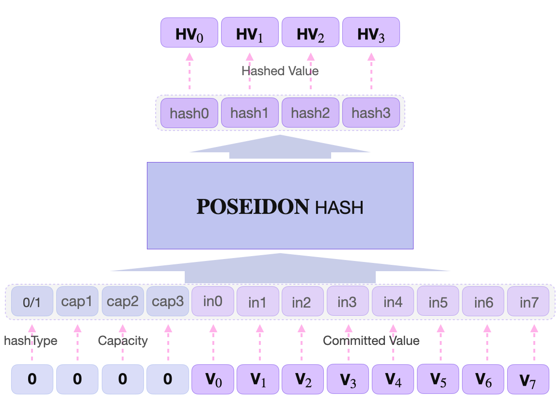 In the case of the zkProver storage, two slightly different Poseidon hashes are used; is used when a branch node is created, whilst is used when a leaf node is created. This depends on the hashType, which is a boolean. So Poseidon acts as when hashType = 1, and when hashType = 0.
