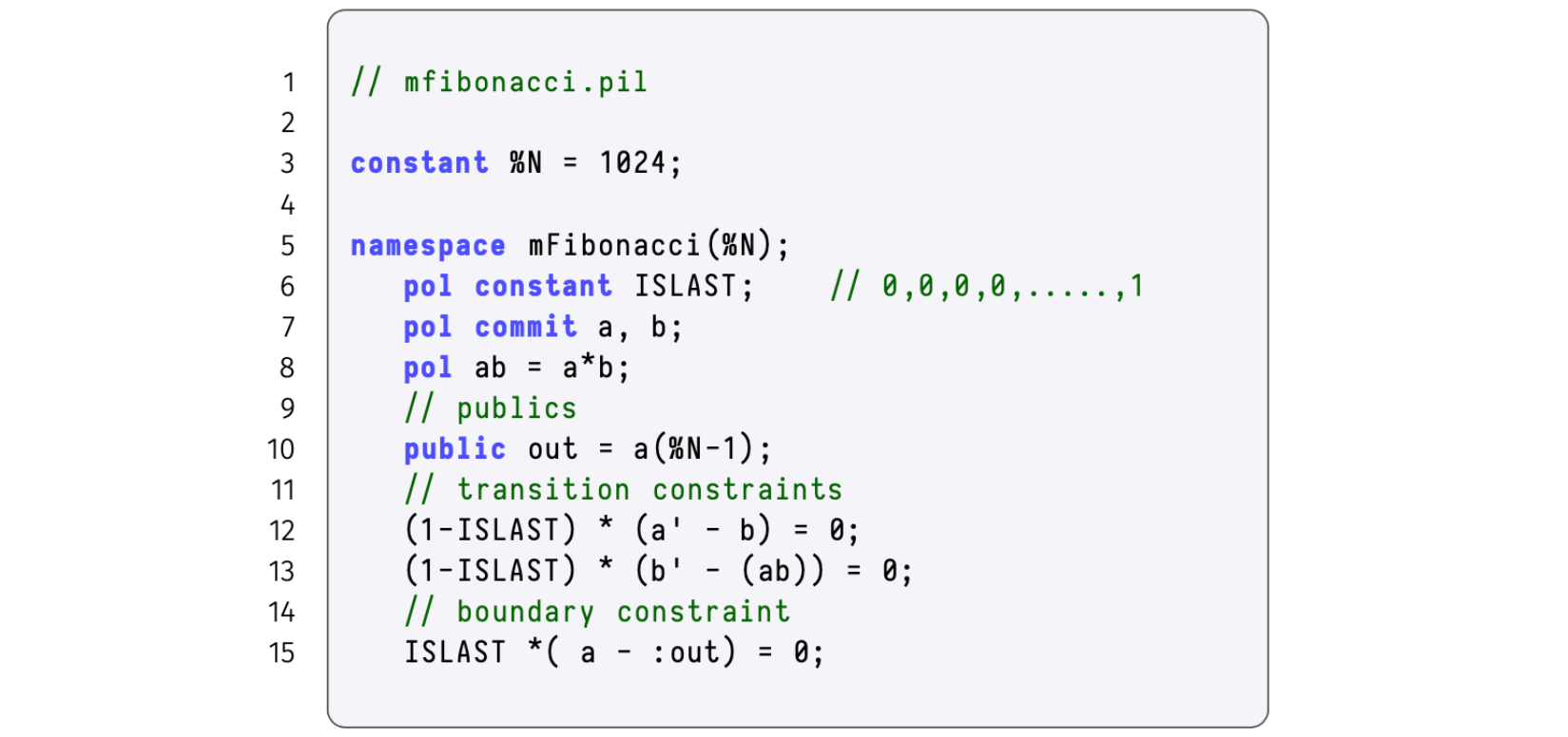 mfibonacci.pil constant %N = 1024; namespace mFibonacci(%N); pol constant ISLAST; // 0,0,0,0,.....,1 pol commit a, b; pol ab = a*b; // publics public out = a(%N-1); // transition constraints (1-ISLAST) * (a' - b) = 0; (1-ISLAST) * (b' - (ab)) = 0; // boundary constraint ISLAST*(a-:out)=0; -