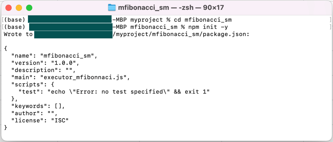 The first step is to make a new subdirectory named mfibonacci_sm, switch directory to it and initialise a node project as indicated below;