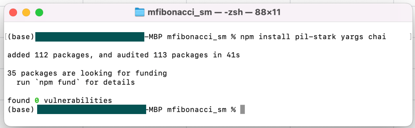 npm install pil-stark yargs chaiThe installation takes seconds, and again the results looks like this,